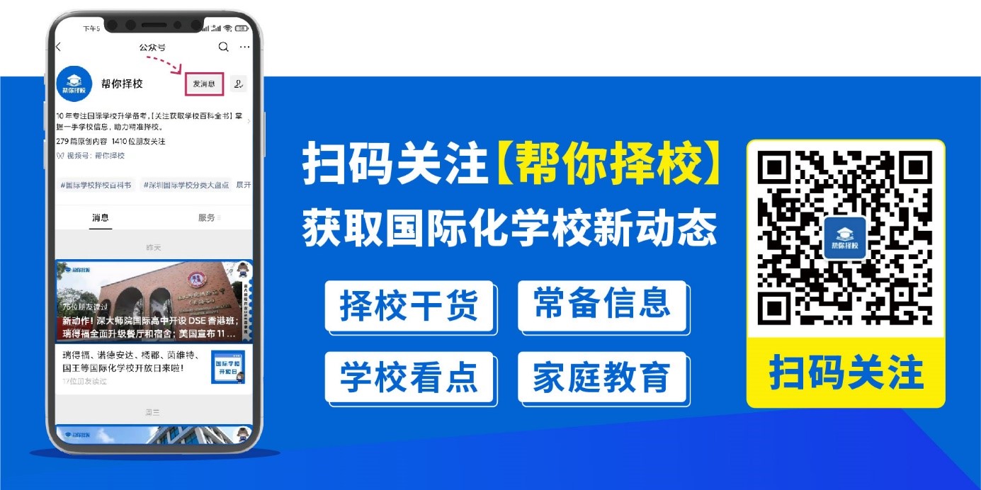 如果您想要提前了解关于国际化学校的全面信息,家长们可以扫码关注“帮你择校”公众号了解国际学校新资讯!