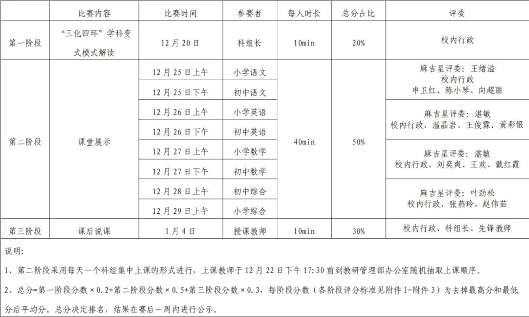 决赛由学校教务、教研部门组织实施,由所有学科组组长以及学科组推荐教师参加,分三个阶段进行。