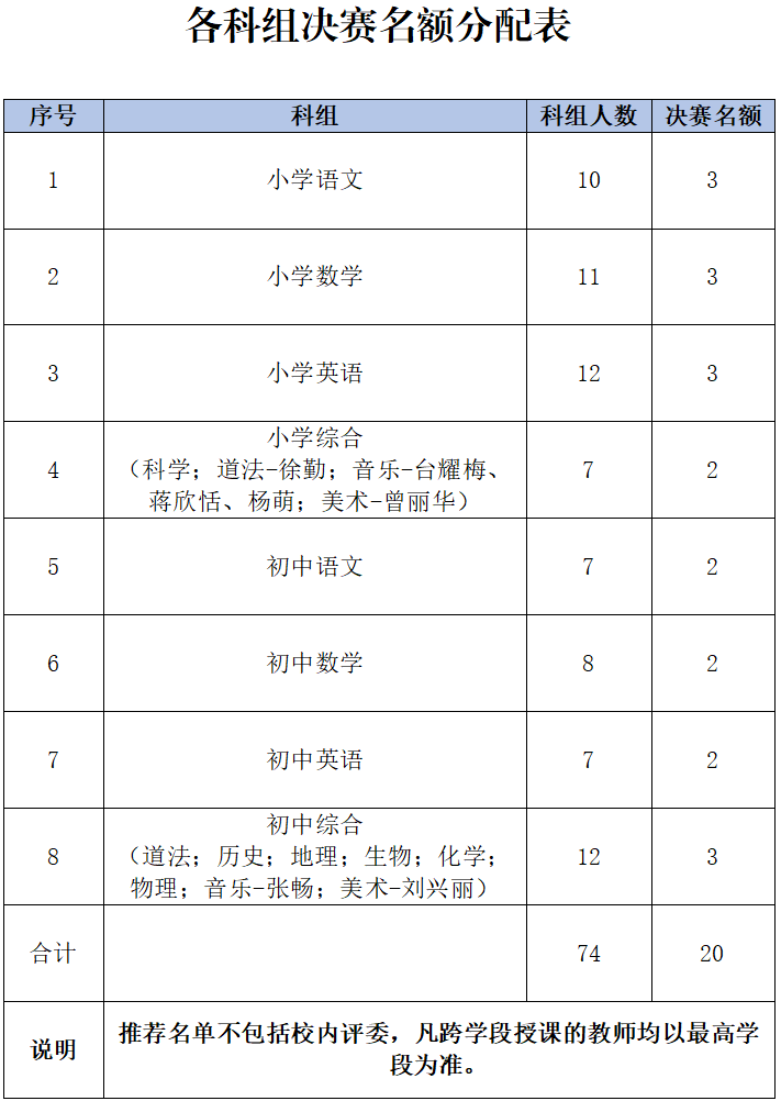 初赛由各学科组内部组织实施,根据分配名额择优推荐教师参加校内决赛。名额分配原则为:按组内使用信息技术教学教师人数(含外教)的28%推荐参加校内决赛。