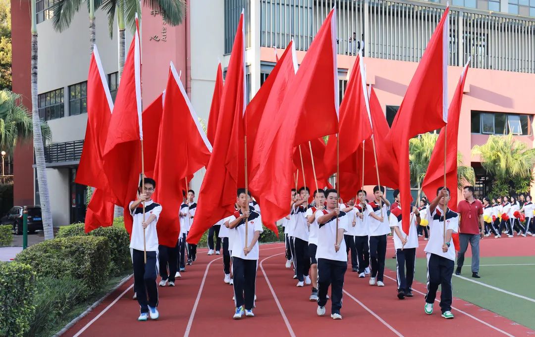 伴随高昂激荡的音乐,国旗、校旗、会旗护卫队,迈着庄严的步伐进场,精神抖擞,气势雄壮,彰显中加少年的青春风采。