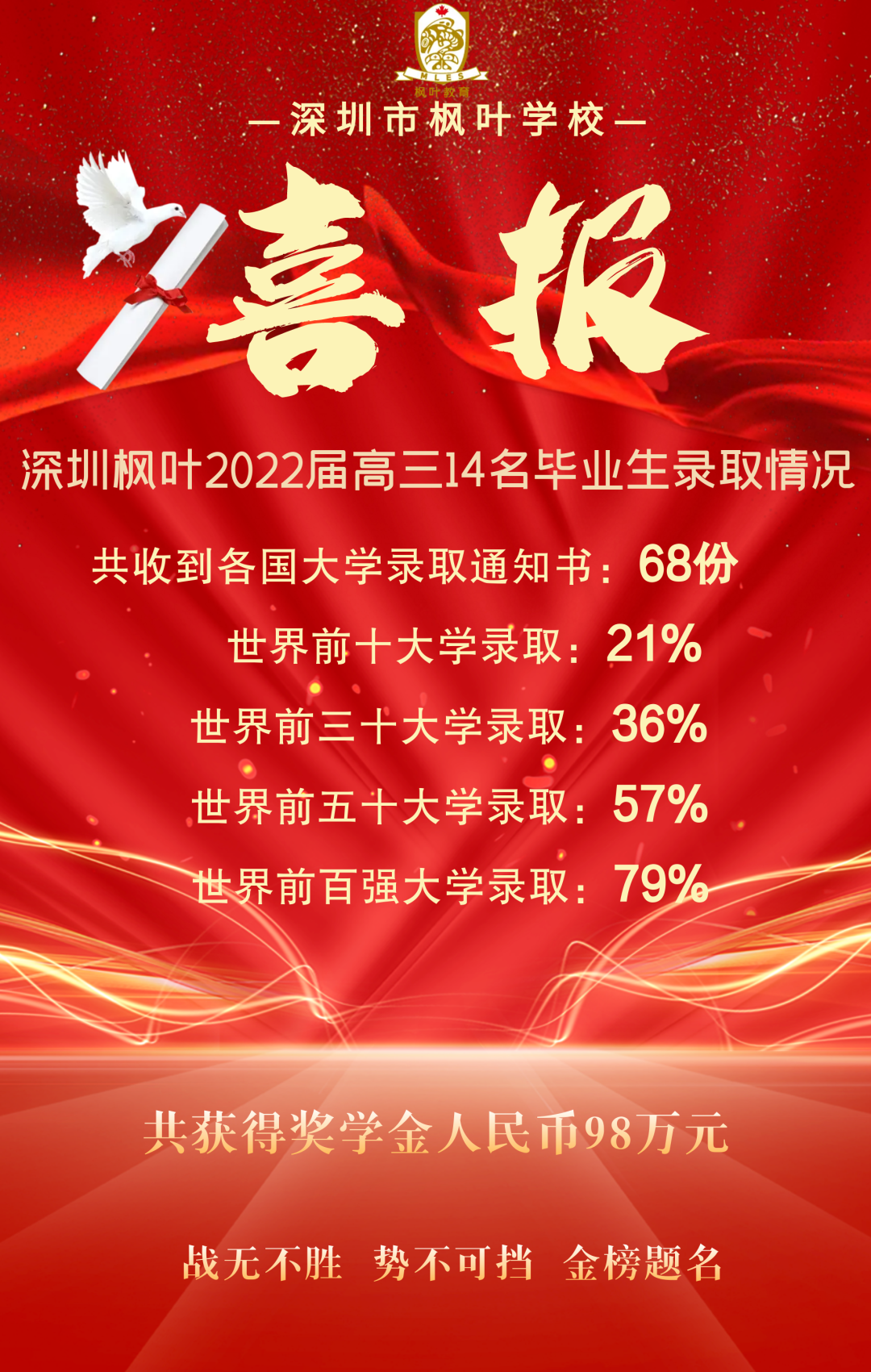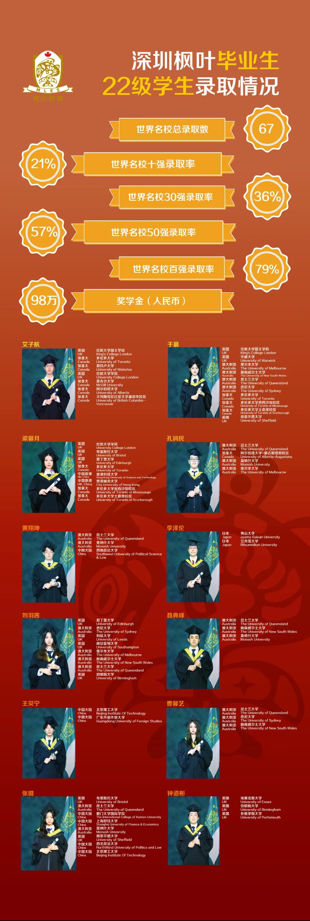 热烈祝贺深圳市枫叶学校第二届毕业生世界十强名校录取率21%,世界三十强名校录取率36%,世界五十强名校录取率57%,世界百强名校录取率79%!