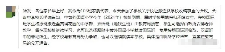 3月份时中黄外国语小学曾邀请学校家委代表,参加学校关于校址搬迁及学校收编事宜的会议。会议上,李春校长明确告知,今年(2021年)中黄外国语小学校址将到期,届时学校用地将归还给政府,但校址具体怎么安排,仍需要等教育局的公开通告。