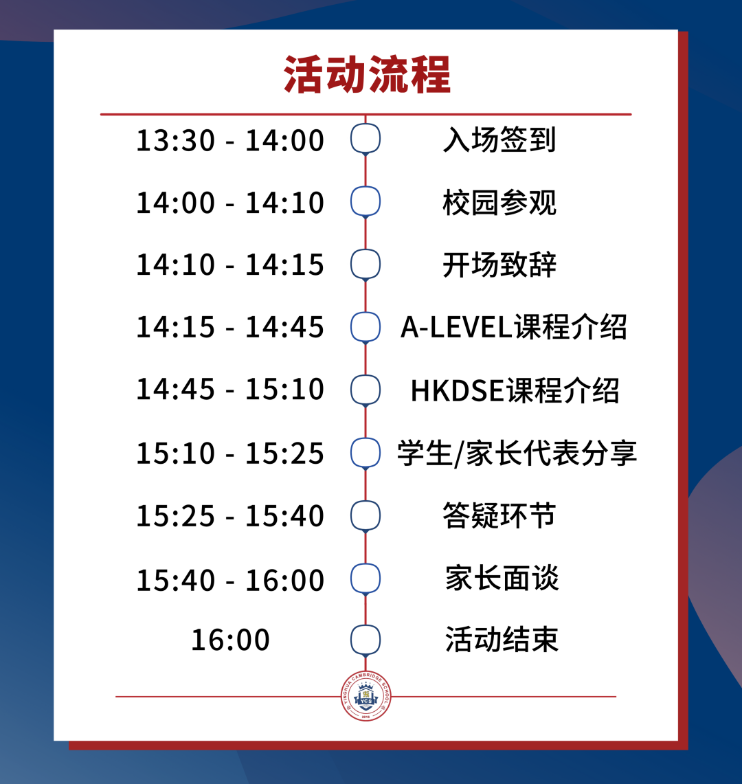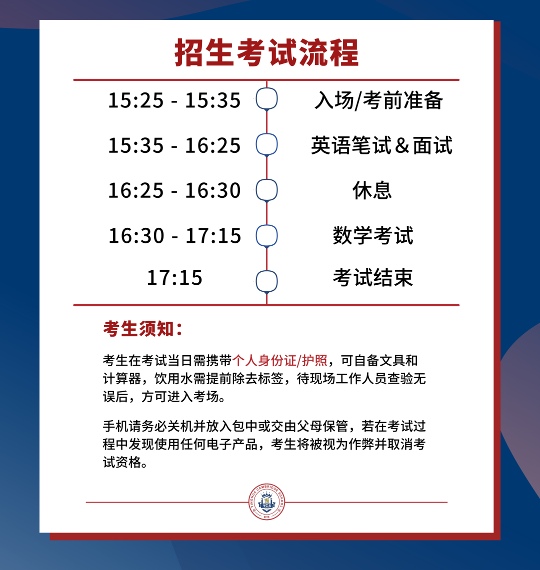 需要参加入学考试的学生将在课程介绍环节结束后,由现场老师带领前往考场做考前准备,具体流程安排如下: