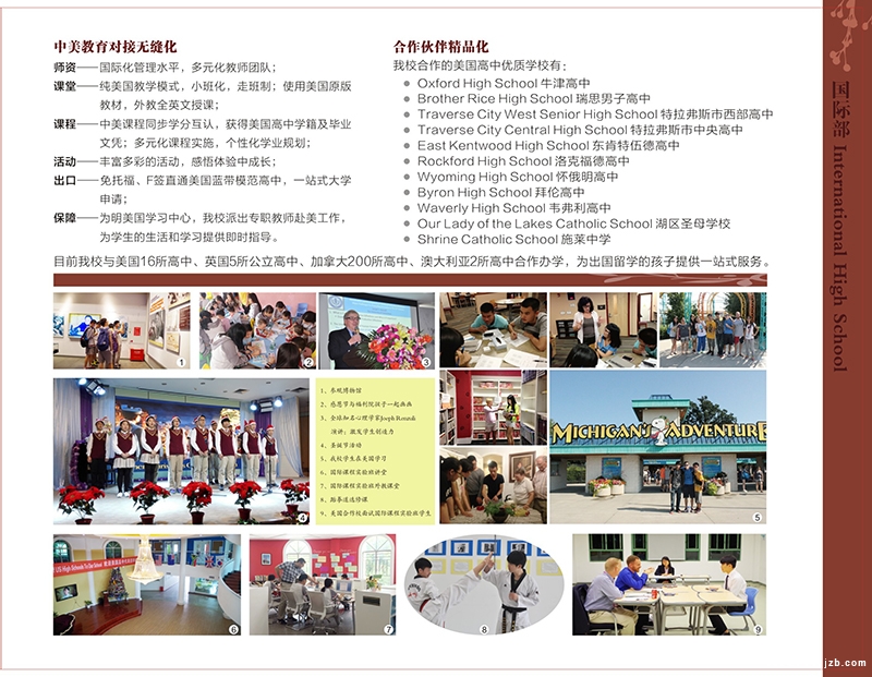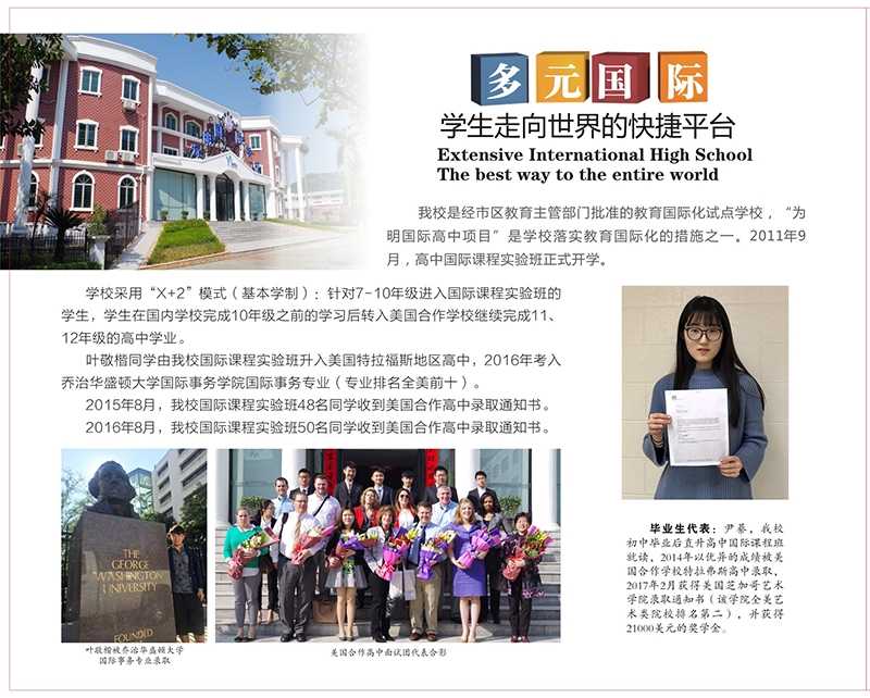 学制——学校采用“2+2”模式(招收初三学生)或“1+2”模式(招收高一学生):学生在国内学校完成初三、高一9、10年级(相当于美国高一、高二)的学习后转入我校美国合作高中继续完成11、12年级的高中学业,并且获得美国高中文凭,实现中美无缝对接。学校新增国际部预备班,招收初一年级学生。