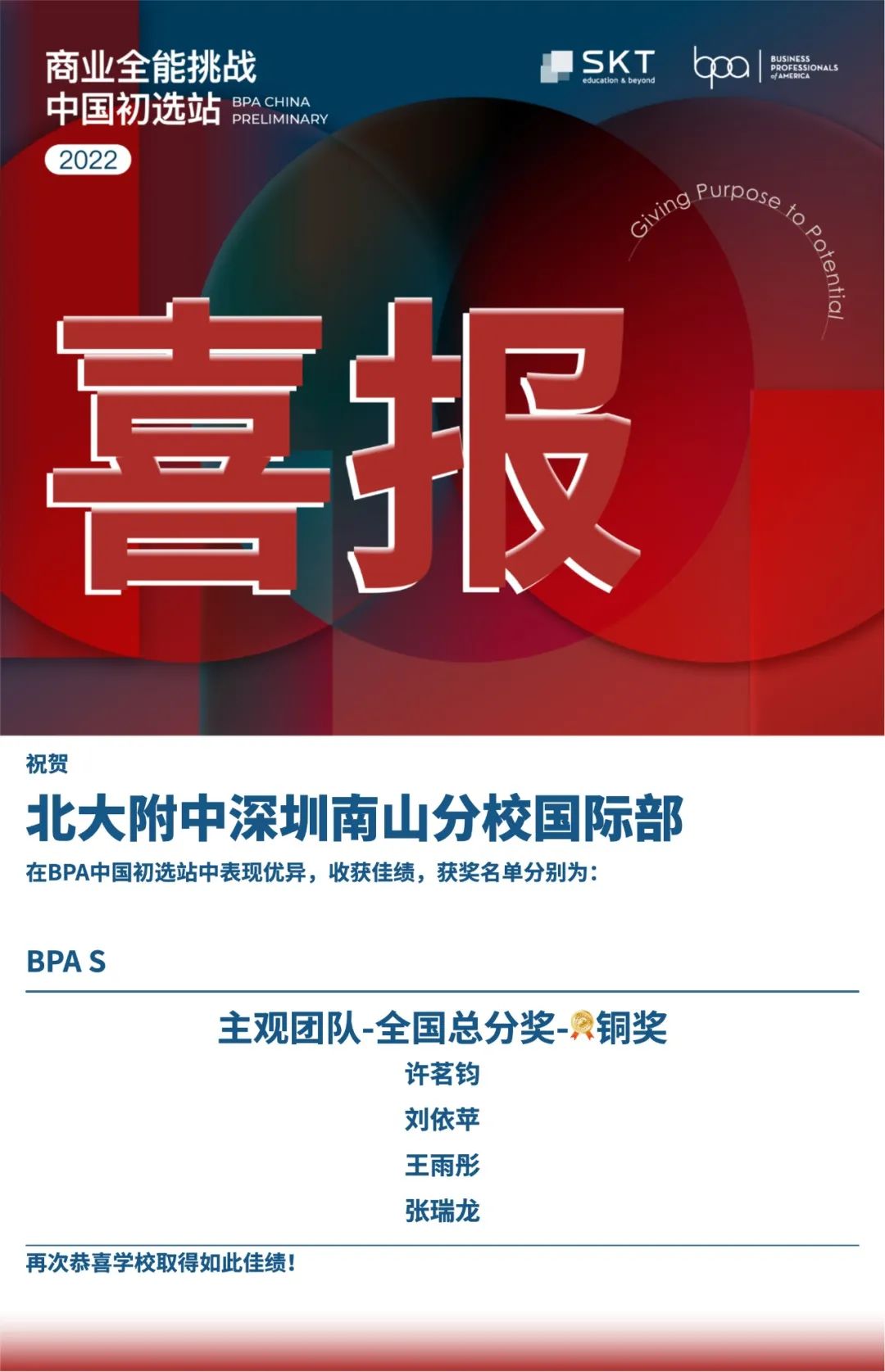 初春时节,北大附中深圳南山分校国际部学子再次于国际学术赛场上一鸣惊人!在“BPA商业全能挑战”取得全国总分奖铜奖!