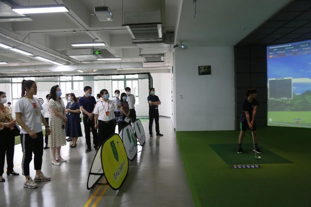 在高尔夫球馆内,大家近距离观看了学生在环形立体感应屏幕前的模拟器击球实践练习,区人大常委会副主任、区总工会主席路玉萍夸赞孩子们的技能训练与精神面貌都非常不错,并对整个艺体楼的丰富资源、活动空间、格局设计、硬件设施与学生的突出表现频频点头称赞。