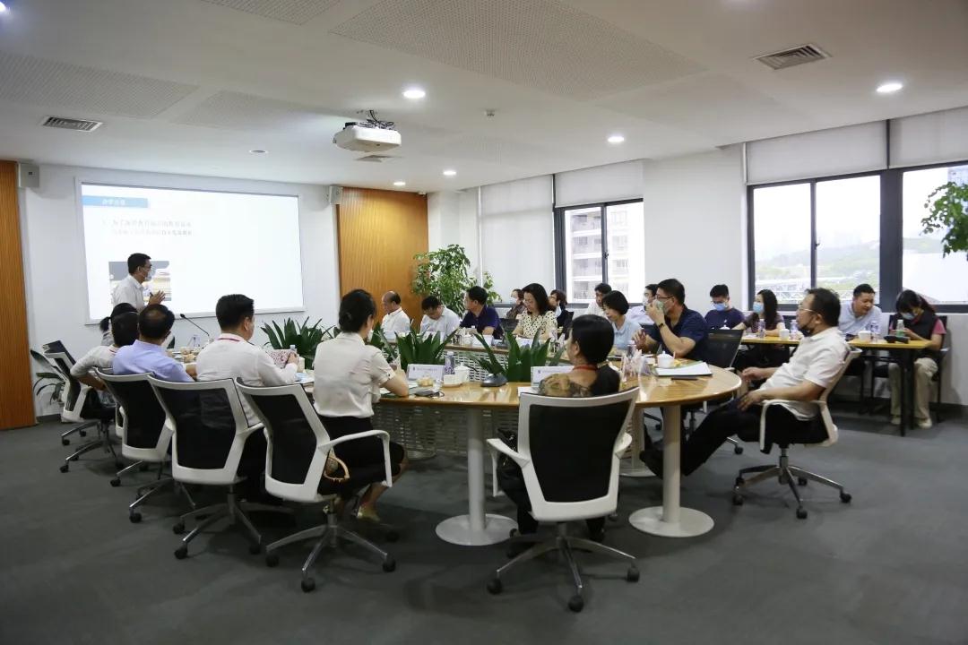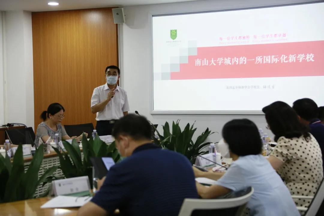 校园参观结束后,来宾们与三位校长在学校会议室开展座谈会。梅连生校长首先以“南山区大学城内一所国际化新学校”为主题对道尔顿新华公学创建发展、办学成果进行了汇报。梅校长总结了办学三年多来,道尔顿新华公学的发展足迹。从疫情期间,道尔顿学子在居家学习中表现出的“阳光自主”个性,很强的4C能力以及道尔顿制所展现的独特优势,学生用自己的行动诠释了道尔顿教育“责任、独立与合作”的内涵。