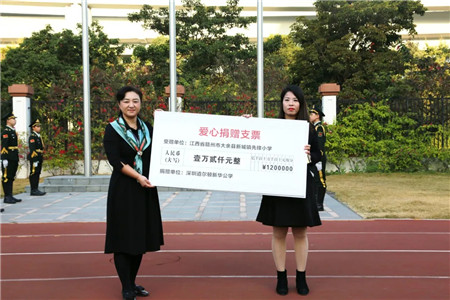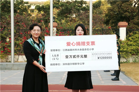 捐赠仪式上,张莉校长代表道尔顿全体教职工与家长朋友向江西省赣州大余县新城镇赤石小学、先锋小学颁发爱心捐赠支票,并通过赤石小学校长谢岚向两所学校师生致以最诚挚的问候。