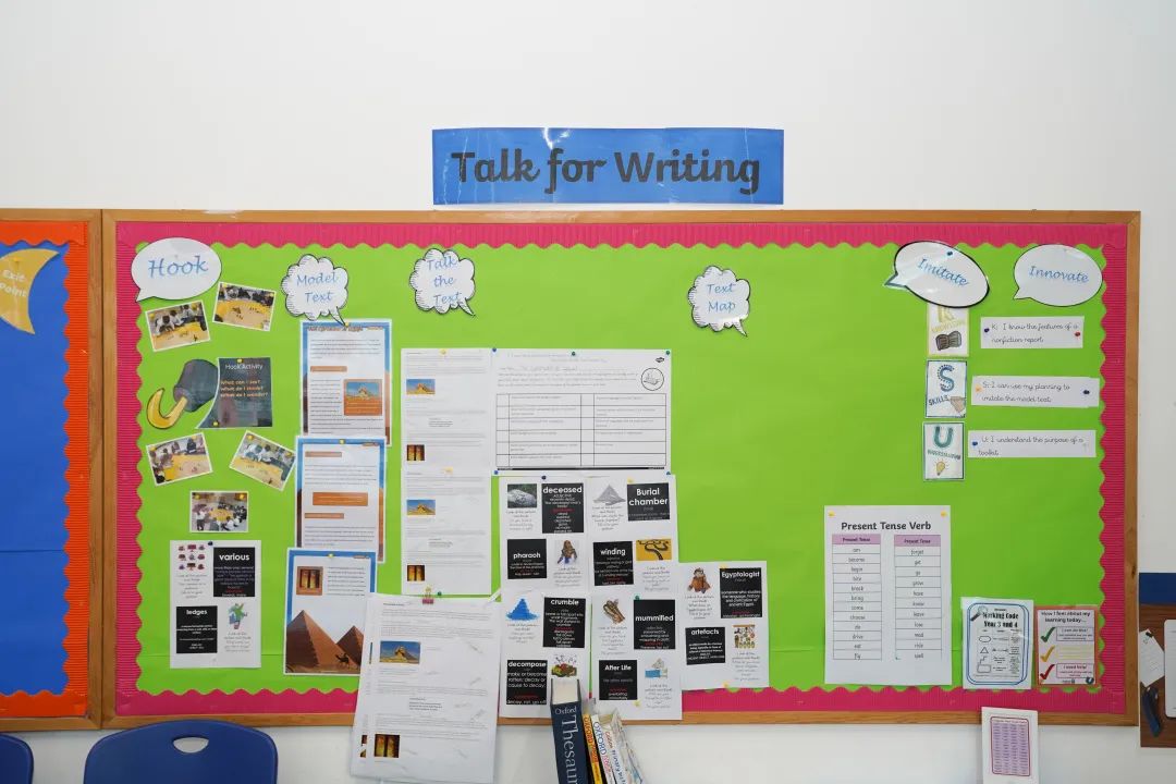 在教室内部,展示区被用作我们核心课程的“工作墙”: 数学、英语、国际小学课程和身心健康课/PSHE。这些展示有助于学生记录所学知识,帮助他们在任务和课程之间建立联系和连贯性。工作墙也可以协助学生有效且独立地学习,因为它不仅提供了良好的实践模型,也展示了所需的支持策略和工具,以确保学生们能够完成任务。