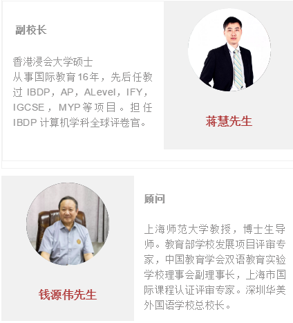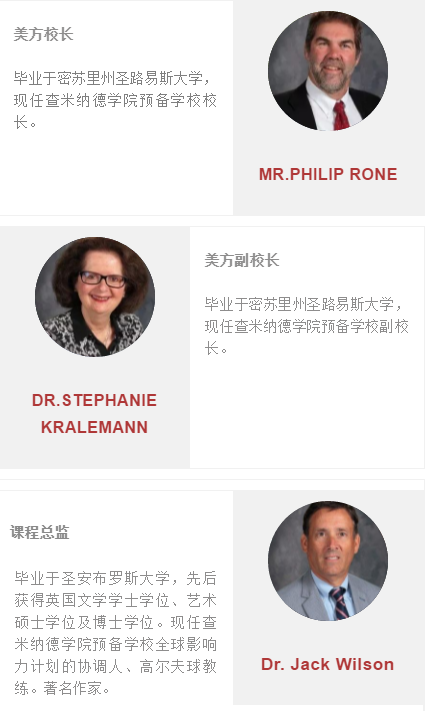 为了办好第一个海外校区,查米纳德学院预备学校精兵尽出:现任总校校长Philip Rone博士担任深圳校区美方校长,总校现任副校长DR.STEPHANIE KRALEMANN女士担任深圳校区学术校长,现任总校全球影响力计划协调人JACK WILSON博士担任国际课程教学总监,Allan Zhang 博士担任升学顾问。