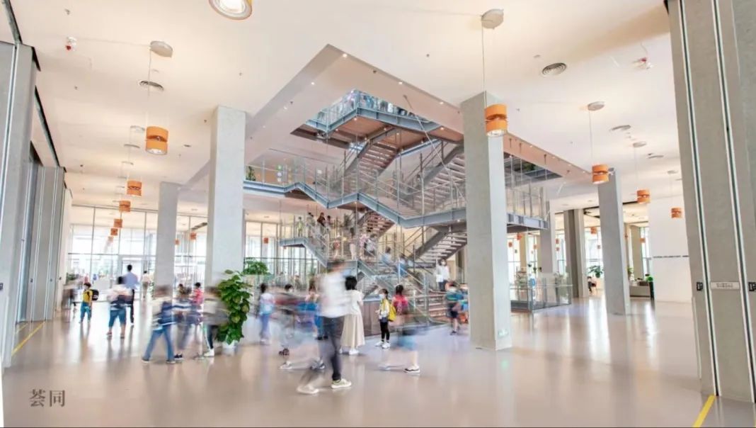 荟同学校中庭的楼梯纵横交错,阳光穿过屋顶的玻璃,洒进学校的每个角落。