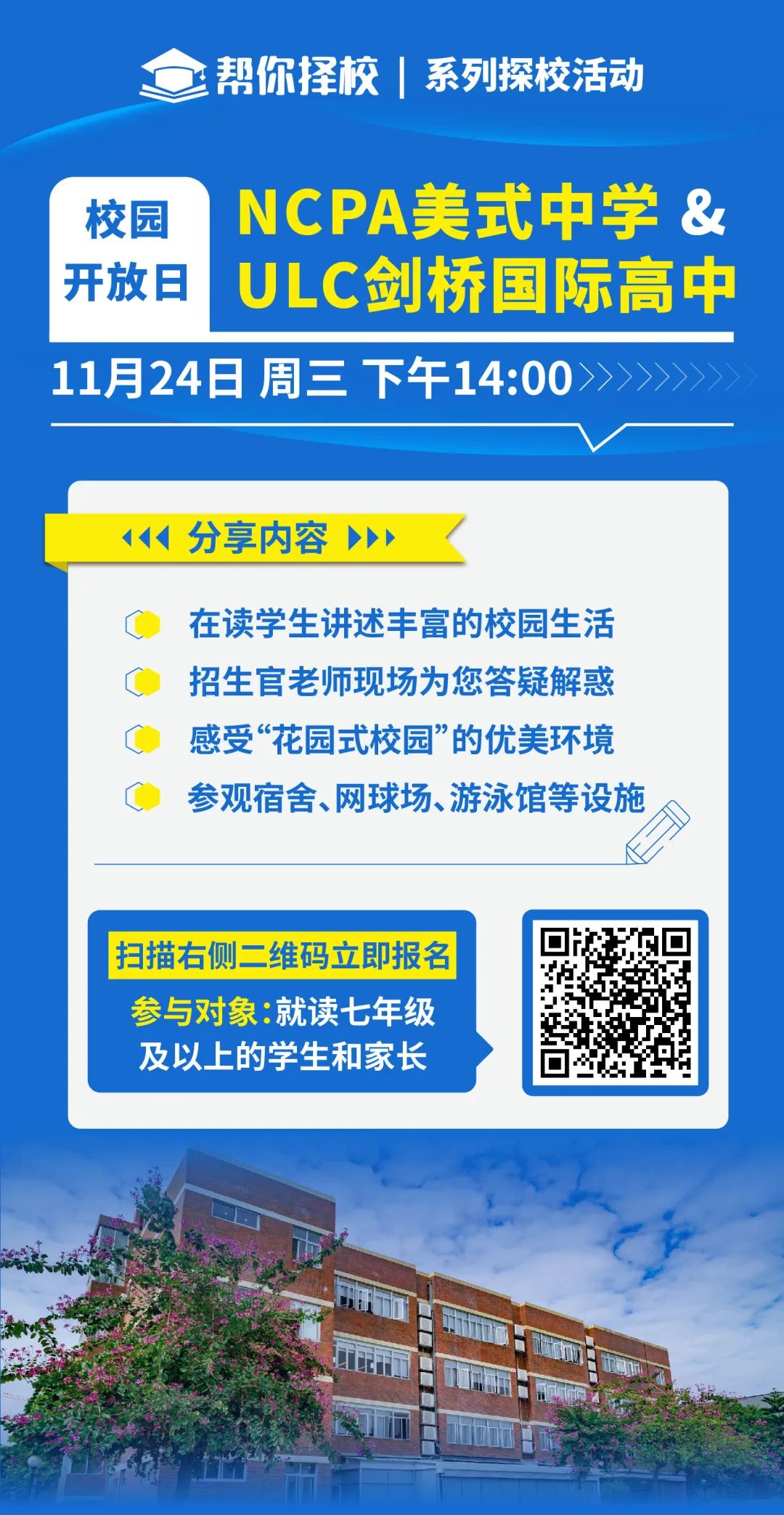 11月24日(周三)NCPA美式中学&ULC剑桥国际高中将联合帮你择校举办专场探校活动,邀您共同感受NCPA&ULC校园风采,全方位了解NCPA&ULC办学理念、课程介绍、升学成果及招生资讯。