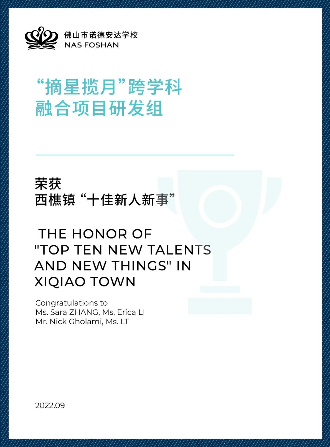 由Ms. Sara, Ms. Erica, Mr. Nick和Ms. LT组成的“摘星揽月”跨学科融合项目研发组,荣获南海区西樵镇政府评选的西樵镇年度“十佳新人新事”。