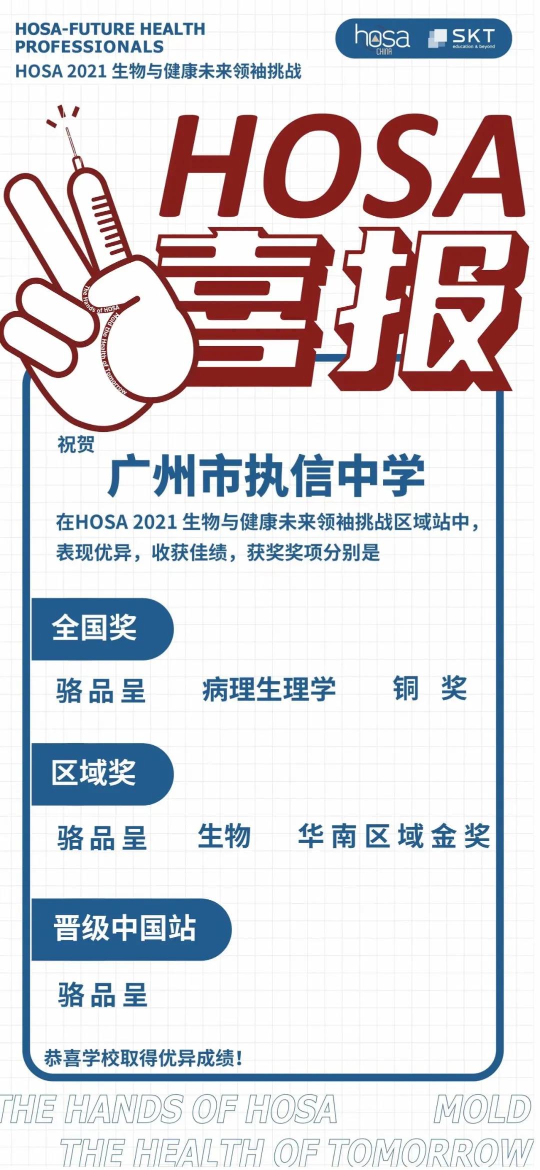 新年伊始,执信国际部学子已经征战在国际竞赛的舞台。继NEC2021全美经济学挑战摘得奖项之后,在HOSA2021全美生物与健康未来领袖挑战(区域站)中,执信国际部学子传来喜讯,骆品呈同学成功晋级中国总决赛,获得2枚奖项,包括1枚全国病理学铜奖,1枚生物区域金奖。