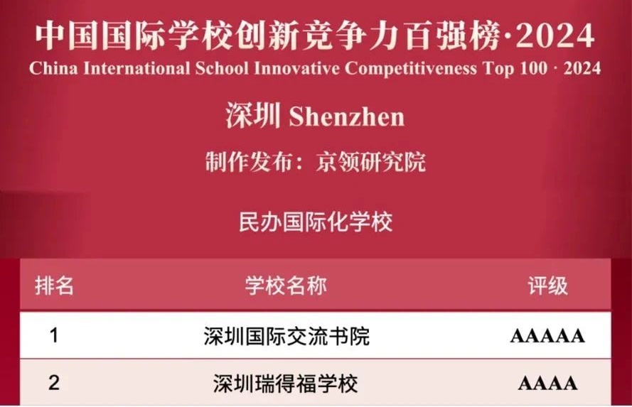 2024年,学校在福布斯中国国际学校排名中位列全国第16,深圳第2,同时在京领【中国国际学校创新竞争力榜】中排名全国第18,深圳第2。