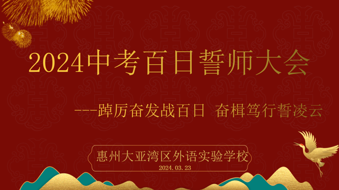 3月23日下午,惠州大亚湾区外语实验学校九年级全体师生和家长满怀激动的心情,欢聚海浪音乐厅,隆重举行中考百日誓师大会。九年级学子们在老师和家长的陪伴与见证下,踏上奋战百日的征途,坚定中考必胜的信心。
