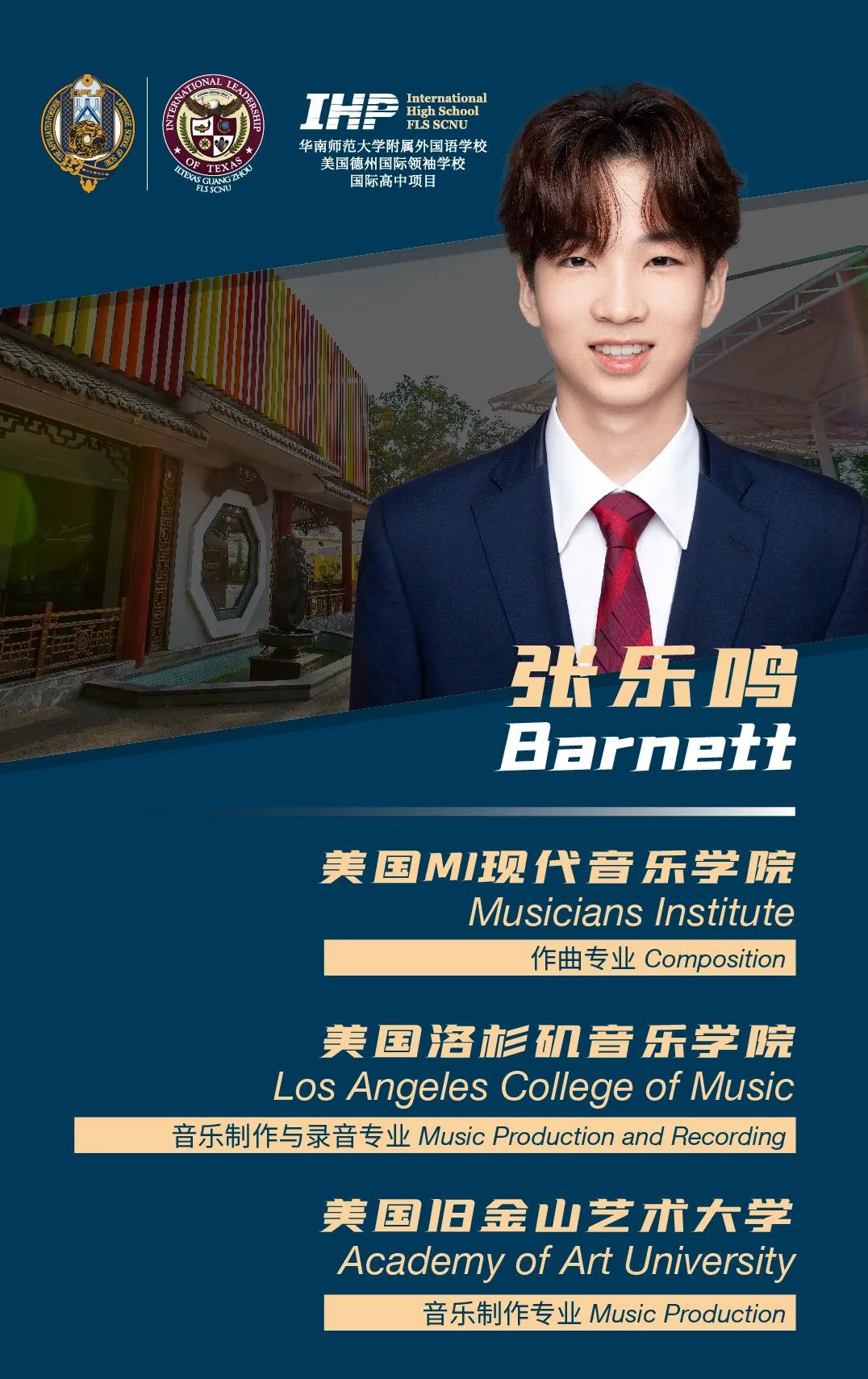 张乐鸣(Barnett),华外国际高中2022届毕业生,在被美国洛杉矶音乐学院(Los Angeles College of Music)、美国旧金山艺术大学录取后,现又收到了美国MI现代音乐学院(Musicians Institute)的录取通知书,专业为作曲(Composition)。
