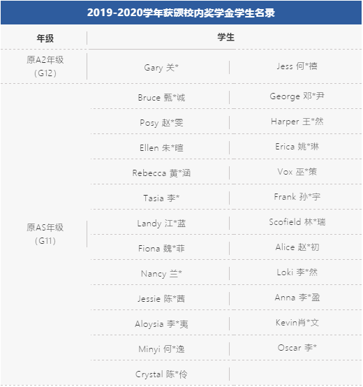根据《校内专项奖学金方案》,AS学生在CAIE考试中取得4A* / A(a)(注:需包括数学学科),授予50%的AS 年级学费数额(约7.2万元)奖学金;A2学生获得牛剑或美国常青藤院校(预)录取,授予50%的A2 年级学费数额(约7.4万元)奖学金;最终拿到前述大学的正式录取,再授予50%的A2年级学费数额(约7.4万元)奖学金。