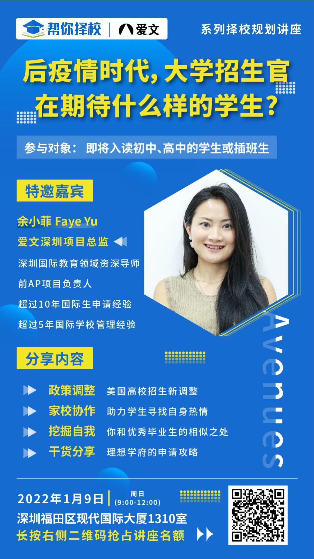 爱文深圳项目总监余小菲Faye Yu将从世界局势的变幻对留学前景的影响、美国高校招生新调整,同时还分享优秀毕业生的特点以及如何成功拿到理想学府的offer,全方面解决你对留学、择校的疑惑。