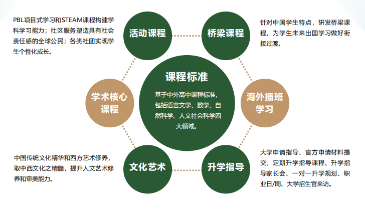 PBL项目式学习和STEAM课程构建学科学习能力;社区服务塑造具有社会责任感的全球公民;各类社团实现学生个性化成长。