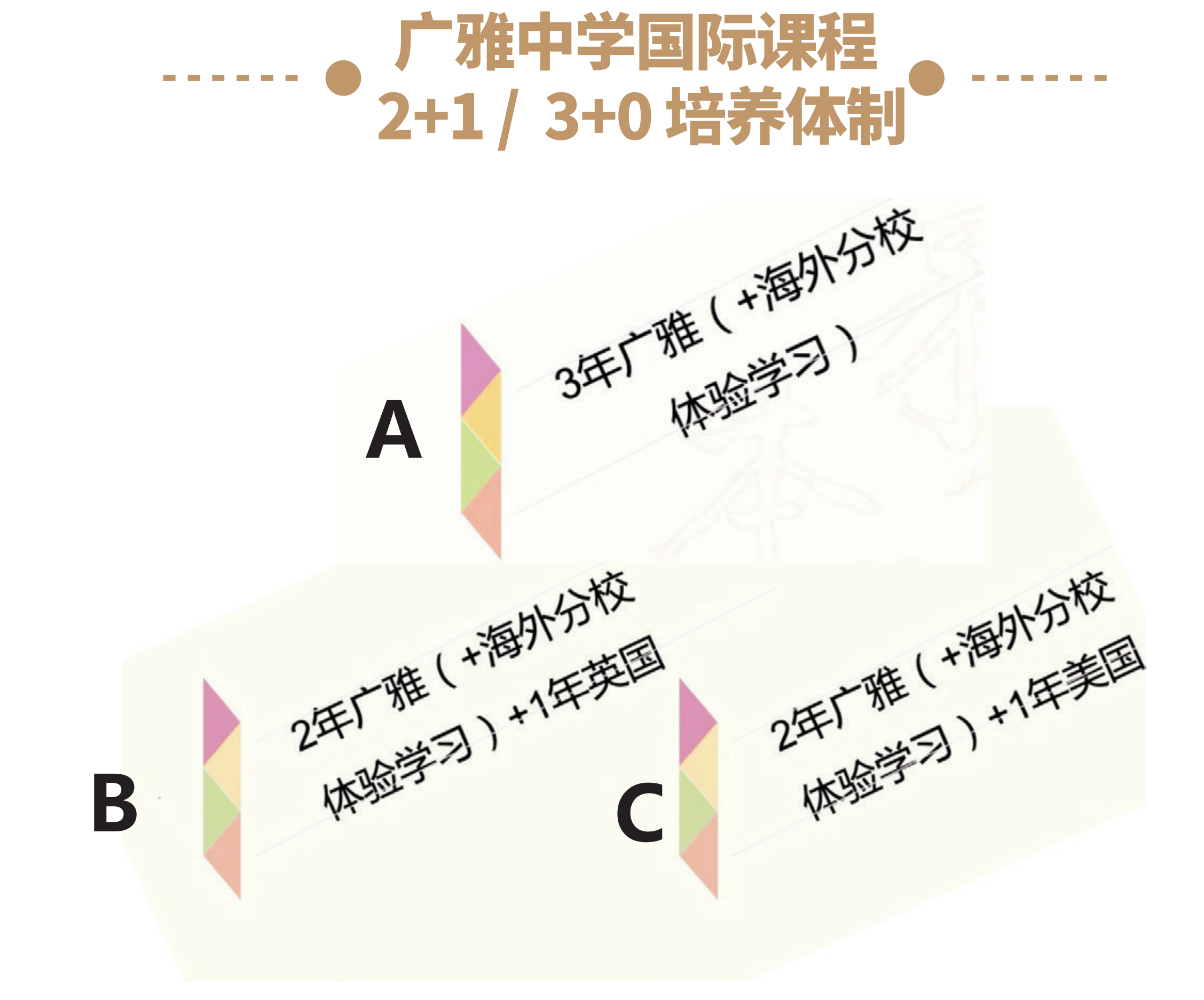 基于英、美“海外分校”的深度合作和资源共享,广雅国际课程为学生设计了独特而优质的2+1培养路径,即高一高二两年在广雅,最后一年自愿选择在合作的英、美“海外分校”完成高三学业,并以英美学校的学生身份申请大学。2+1的培养方式是相对于3+0的培养模式而言的,3+0即高中三年都在广雅国际课程学习。
