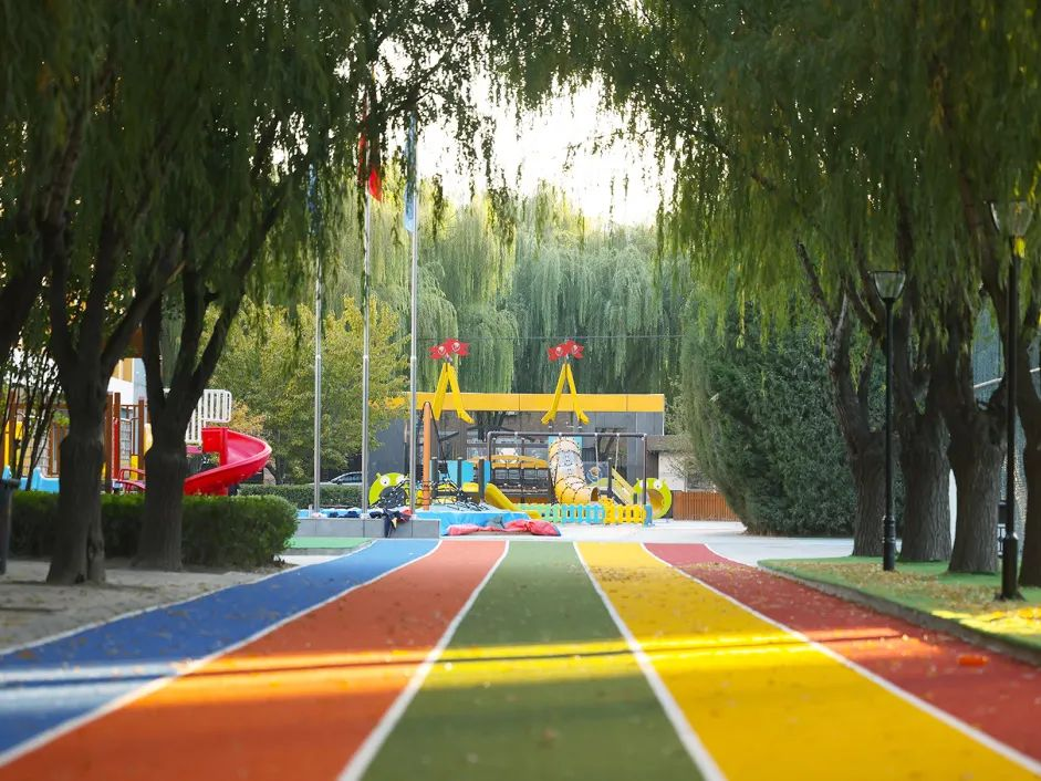 户外游戏区更是孩子们的天堂。在孔庙南侧新增了一个完整的儿童活动区,包含水池、沙池、感官区、运动区,树屋、吊桥等组成的感统前庭觉训练区更是让孩子们乐在其中。蹦床、户外击打乐器等艺术及语言智能区则让孩子们在游戏中锻炼语言能力,开发艺术潜能。巨大的恐龙艺术雕像屹立在活动区旁,为孩子们的游戏增添了一份趣味。小高篮球场和幼儿园运动场也重新设计并升级了材质,提升了孩子们的运动体验并确保安全健康。