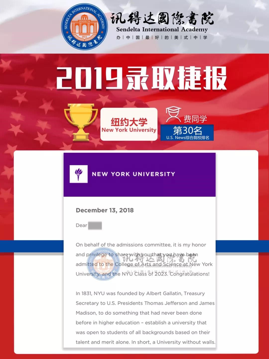 讯得达国际书院费同学,以优异的TOEFL和SAT成绩以及出彩的活动,成功被U.S. News 2019年美国最佳大学排名第30名的纽约大学(New York University)录取!
