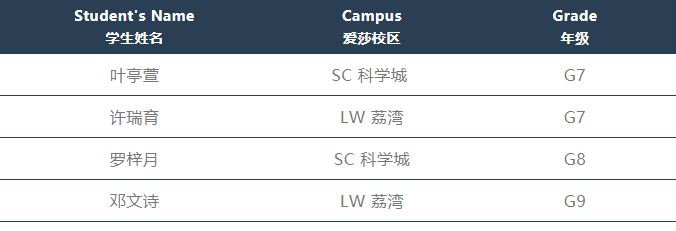 广州科学城爱莎外籍人员子女学校击剑校队派出4名初中学生代表参赛,分别参加初中组女子花剑个人项目及团体项目。经过3天的激烈对决,爱莎击剑队勇夺第十三届中国中学生击剑锦标赛初中组女子花剑团体第一名,8年级学生罗梓月斩获初中组女子花剑个人亚军。这意味着罗梓月凭借此优秀成绩入选U15世界中学生夏季运动会中国代表团,并将有机会代表中国前往巴西出战。