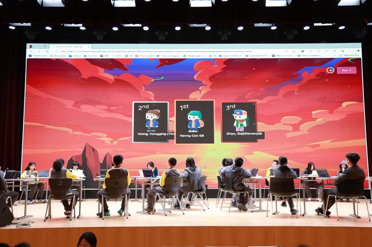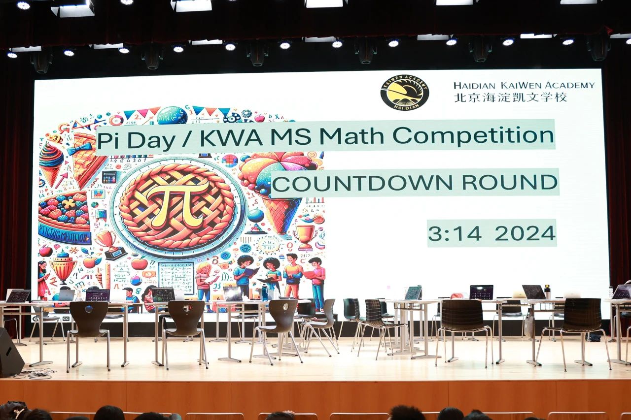 如果说,小学部的π Day关键词是“游戏+体验”,初中部的活动则是“数学+竞技”的硬核即时排名赛。今年的活动参考了加州大学伯克利分校数学竞赛的模式,创造性地开设了引人入胜的“Countdown即时排名”模式,让同学们在屏息凝神中,共享数学竞赛的激动时刻,进一步提高学生对数学的热情和兴趣,也让海淀凯文初中部“深藏不露”的数学大神们,拥有了舞台上的高光时刻。