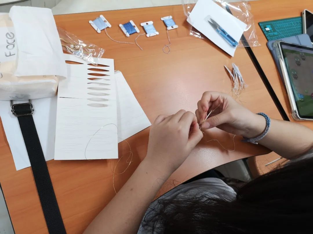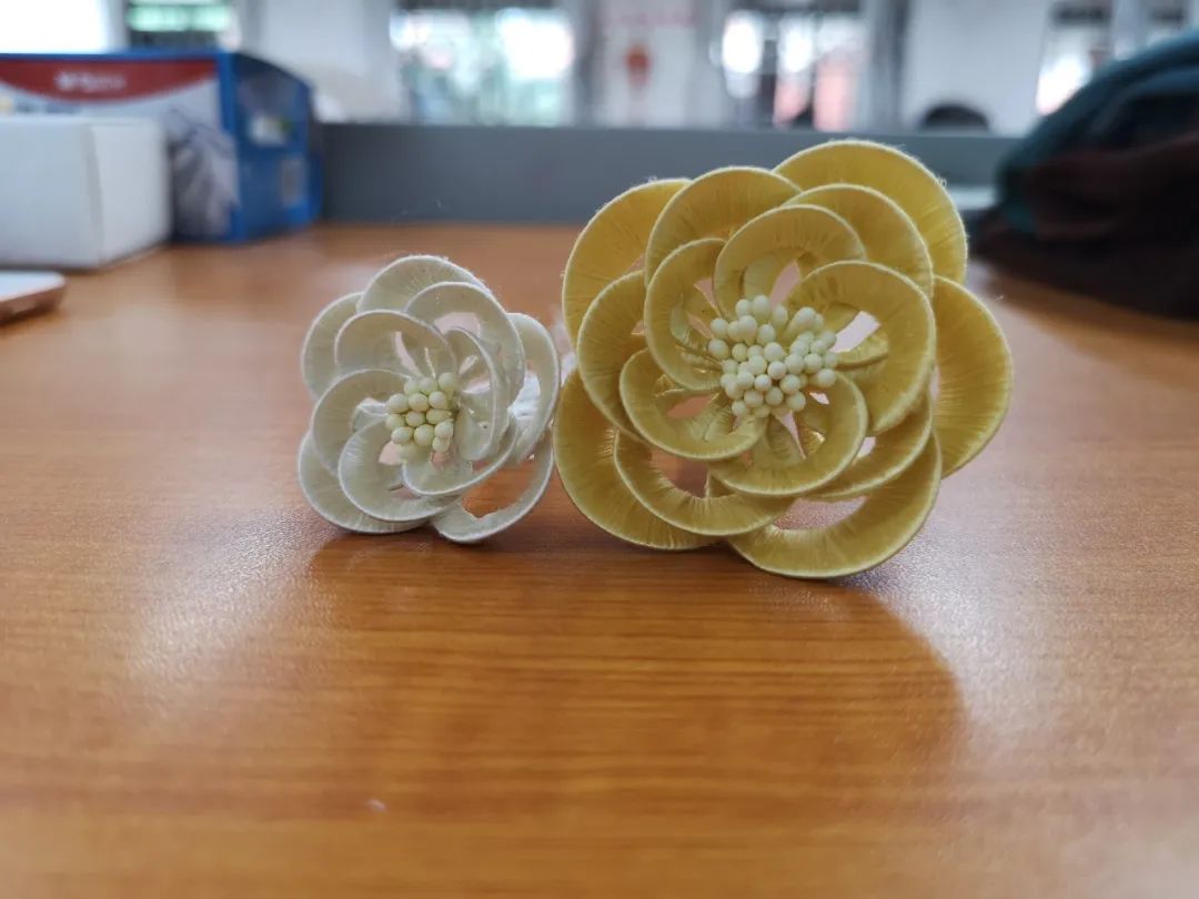 我们当时需要把线先理到绕线板上,然后大家用桌子把线撑好然后开始绕线,到后面大家绕得都打结了,全都变成了团团,我们后面还用了两次课去拆这些结......后面我们都学聪明了,两两配合,一个人负责撑线,一个人负责绕线,在看起来要打结的时候立刻调整位置,后面我们就很少打结了。我希望我们在制作缠花的时候可以静下心来,脱离繁忙的学习生活,感受手工艺品的魅力。