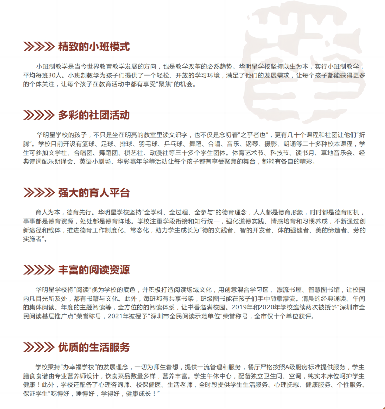 华明星学校以办幸福学校、做温暖教育、创多彩生活为宗旨,实施精致教育,致力于打造一个“小而精”的园林式书香学校。华明星学校注重学生习惯养成和气质培养,为孩子们打造多元化的发展空间,助力每一位学子成为中华民族各行各业的璀璨明星。